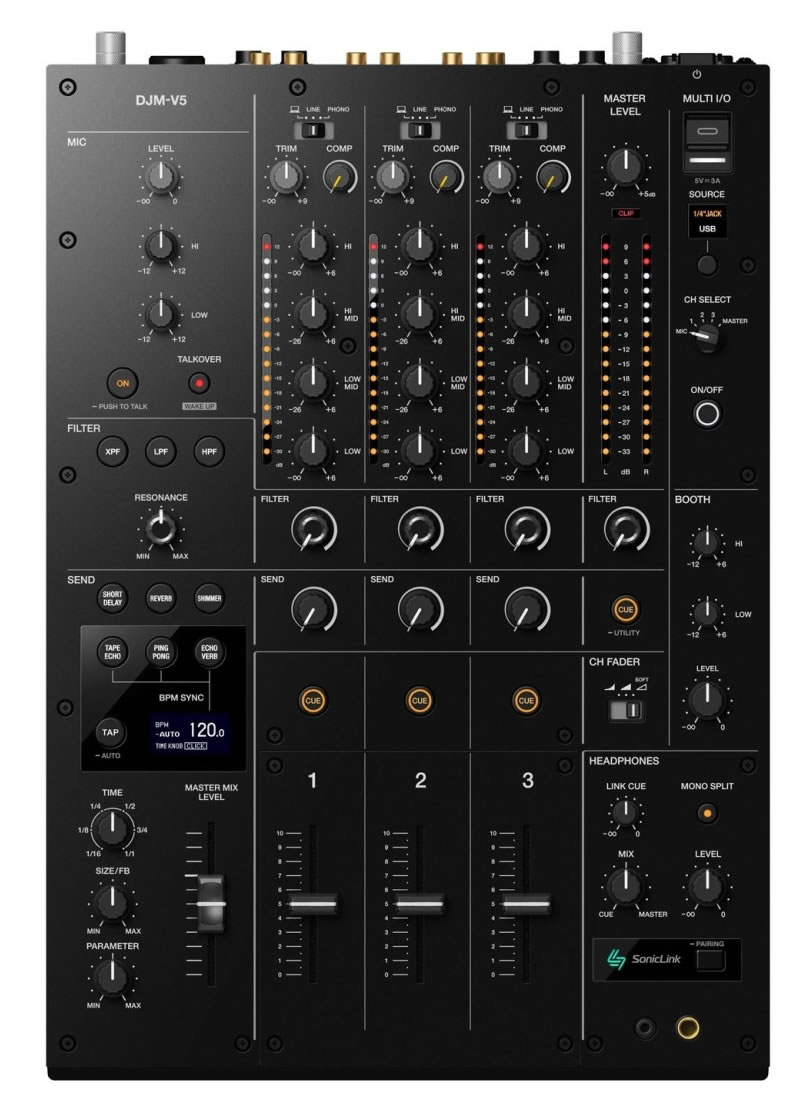 DJM-V5 zároveň poskytuje široké možnosti kreatívnej práce s efektmi. Zabudované Send FX sú synchronizované s BPM a umožňujú rýchlo a presne pridávať priestor, rytmus alebo pohyb do mixu bez narušenia jeho stability. Dopĺňajú ich viacnásobné typy filtrov, ktoré dávajú DJ-ovi možnosť tvarovať zvuk od jemných prechodov až po výrazné, dramatické momenty.