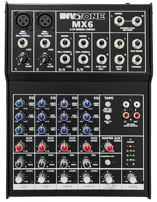 Malý kapelový mixpult s kvalitným zvukom. Vstupy: 1 x mikrofon/linka, 2 x LINE stereo vstup, 1x CD/TAPE IN/OUT, Phones, nízky šum, potenciometre Gain, High, Low, Pan, Level na mikrofónnom/linkovom vstupe, a potenciometre BAL, Level na stereo vstupoch. Výstupy JACK 6,3 mmm.