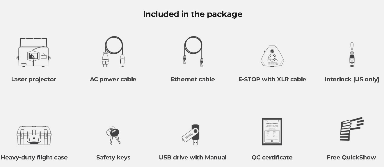 Odolný preprtavný kufor, 1,5 m napájací kábel AC, 10 m signálny kábel Ethernet RJ45, núdzový diaľkový ovládač E-STOP s 10 m 3-pinovým XLR káblom, sada 4 bezpečnostných kľúčov, adaptér Interlock bypass [dodávaný len pre USA], pamäťový kľúč USB s používateľskou príručkou, certifikát kontroly kvality.