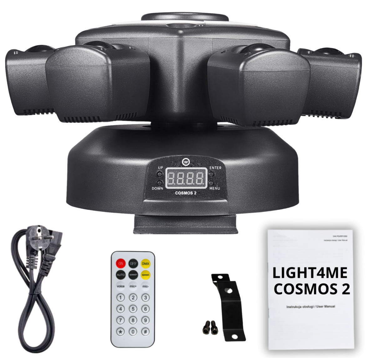 Light4Me Cosmos 2 ponúka efekty lúča, kaleido/gobo, kruhu, bieleho a zlatého stroboskopu, ako aj R/G lasery , ktoré je možné voľne kombinovať. Vďaka pokročilým RGBW LED diódam pre efekty lúča a kaleido/gobo, RGB kruhovému efektu, bielo-zlatému stroboskopu a červeným aj zeleným laserom môžete vytvoriť show, ktorá ohromí publikum v každom klube, na firemnej párty alebo počas vonkajšej akcie. Jeho kompaktný dizajn a ľahká konštrukcia ho robia ideálnym pre profesionálnych DJov aj mobilné hudobné kapely