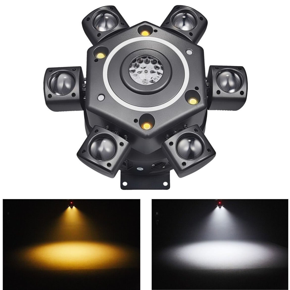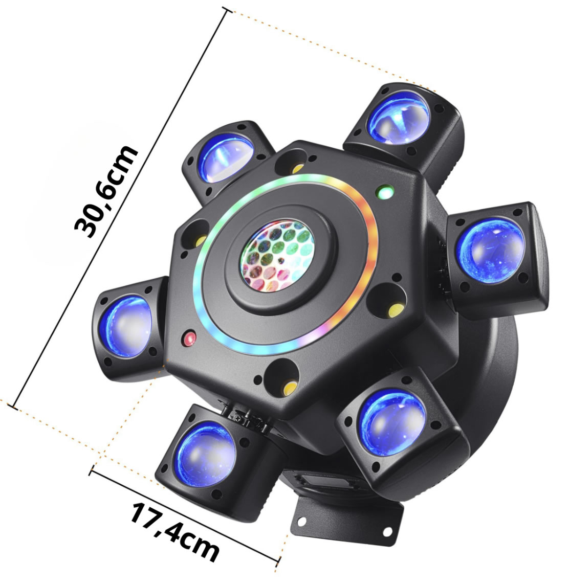 * kaleido/gobo efekt : 6x3W RGBW LED 4 v 1 (3x3W kaleido, 3x3W gobo), nastaviteľná rýchlosť otáčania, 4 gobo vzory
